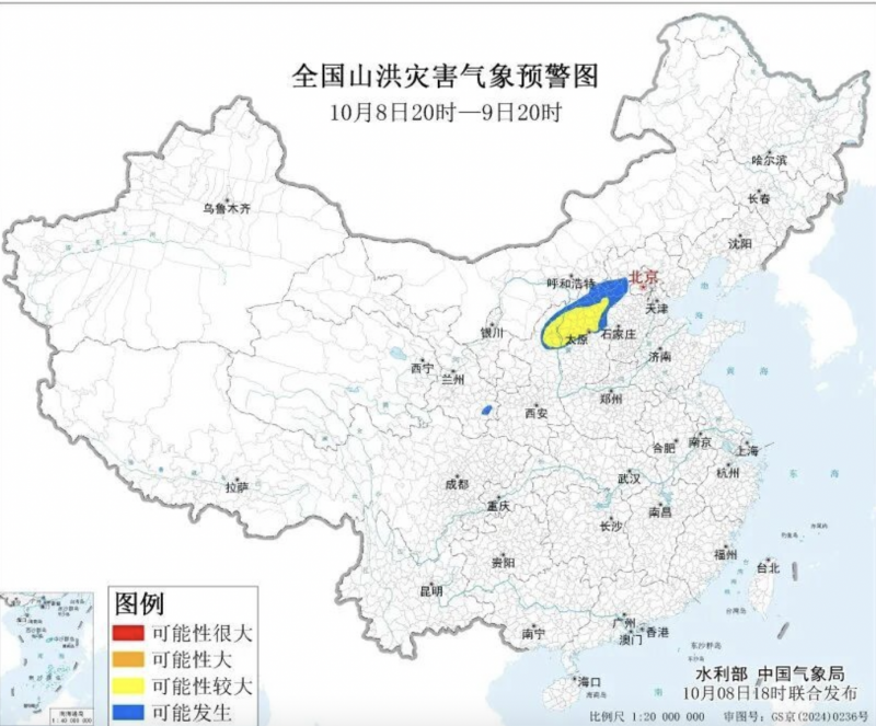 预计10月8日20时至9日20时,河北西北部、山西北部、陕西北部、甘肃南部等地部分地区可能发生山洪灾害(蓝色预警),其中,山西北部、陕西北部等地部分地区发生山洪灾害可能性较大(黄色预警)。