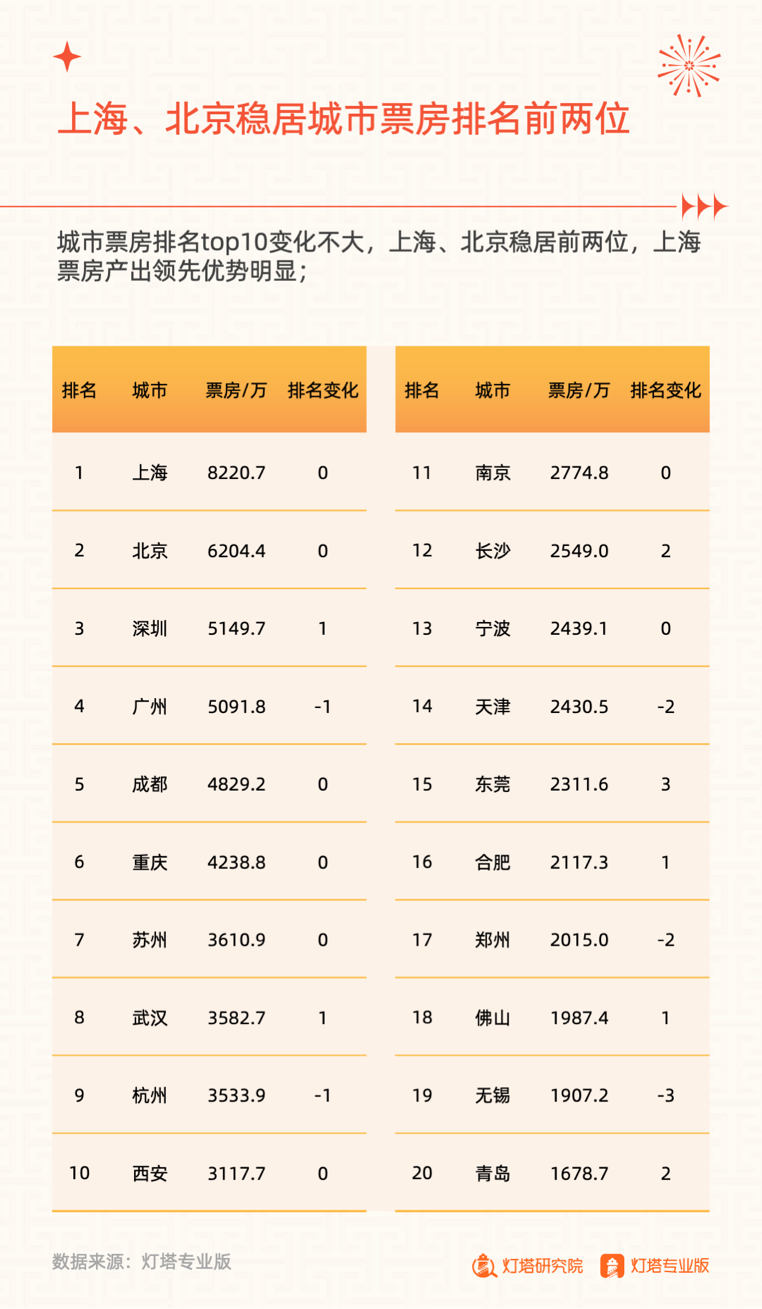 城市票房排名中,上海、北京稳居前两位,上海领先优势明显。全国10家影城票房破百万,武商梦时代摩尔影城(IMAX激光店)票房产出居首。
