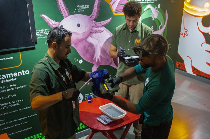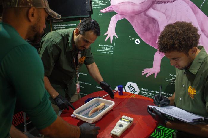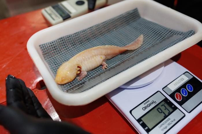 新展区由生物学家和动物护理团队共同管理,旨在提升公众对野生动物保护与生物多样性保育的认识,呼吁社会关注非法野生动物贸易带来的危害。10月8日,在巴西里约热内卢生物公园,技术人员为钝口螈称重和测量体长。