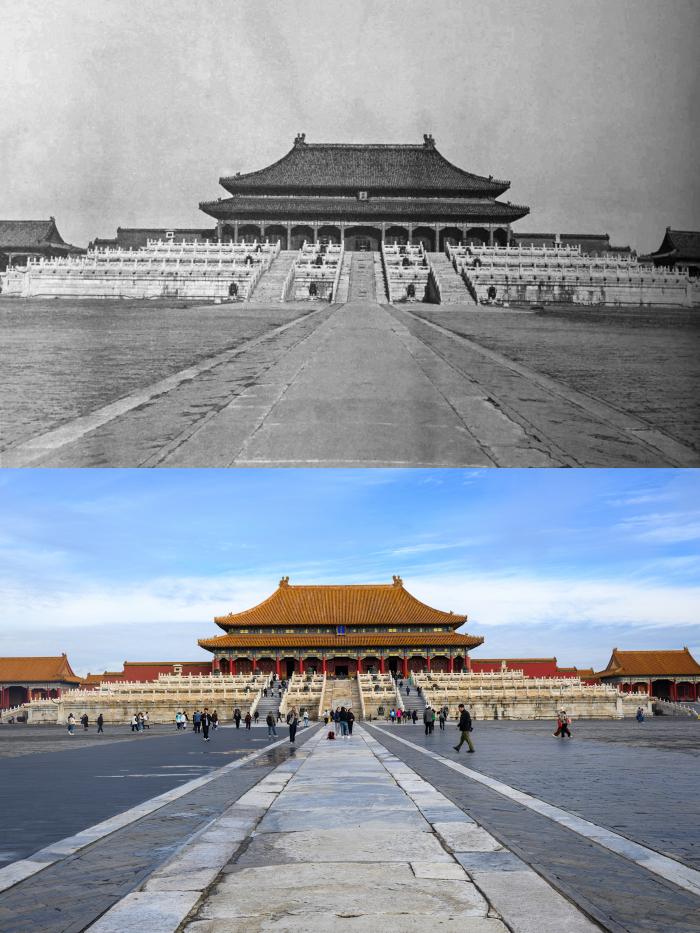 拼版照片:上图为20世纪初拍摄的太和殿(故宫博物院供图);下图为2025年10月10日拍摄的太和殿(新华社记者金良快摄)。新华社发
