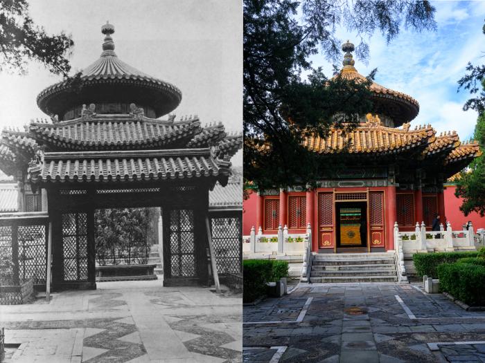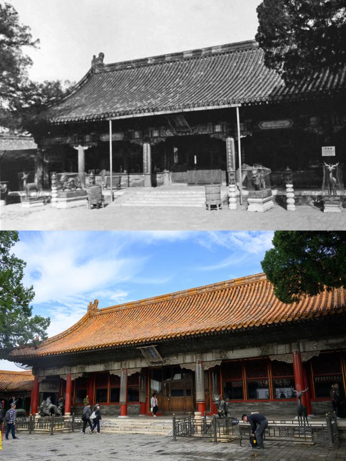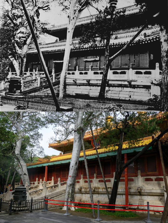拼版照片:上图为20世纪初拍摄的交泰殿(故宫博物院供图);下图为2025年10月10日拍摄的交泰殿(新华社记者金良快摄)。新华社发