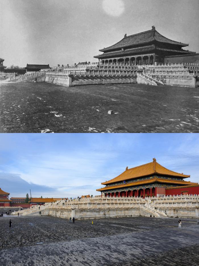 一百年来,从萌芽诞生到曲折成长、从步履维艰到阔步前行、从探寻求索到锐意创新的发展历程,故宫徐徐铺陈一幅“换了人间”的百年画卷。拼版照片:上图为20世纪初拍摄的太和殿(故宫博物院供图);下图为2025年10月10日拍摄的太和殿(新华社记者金良快摄)。新华社发