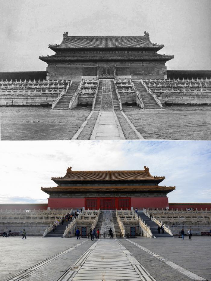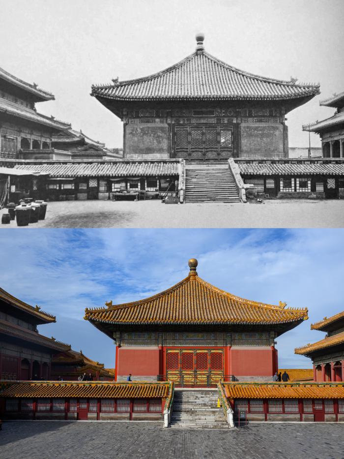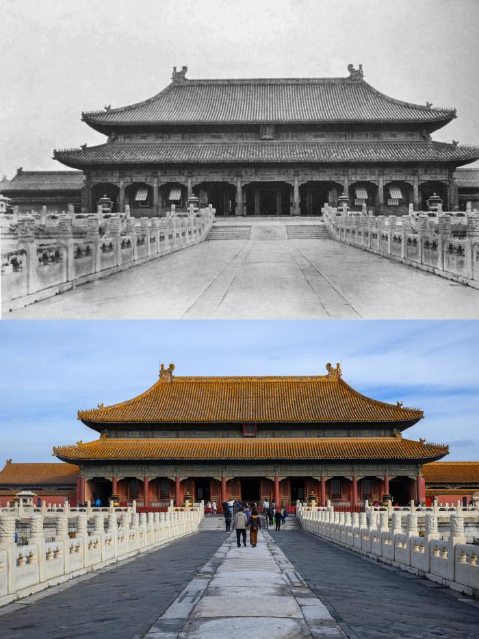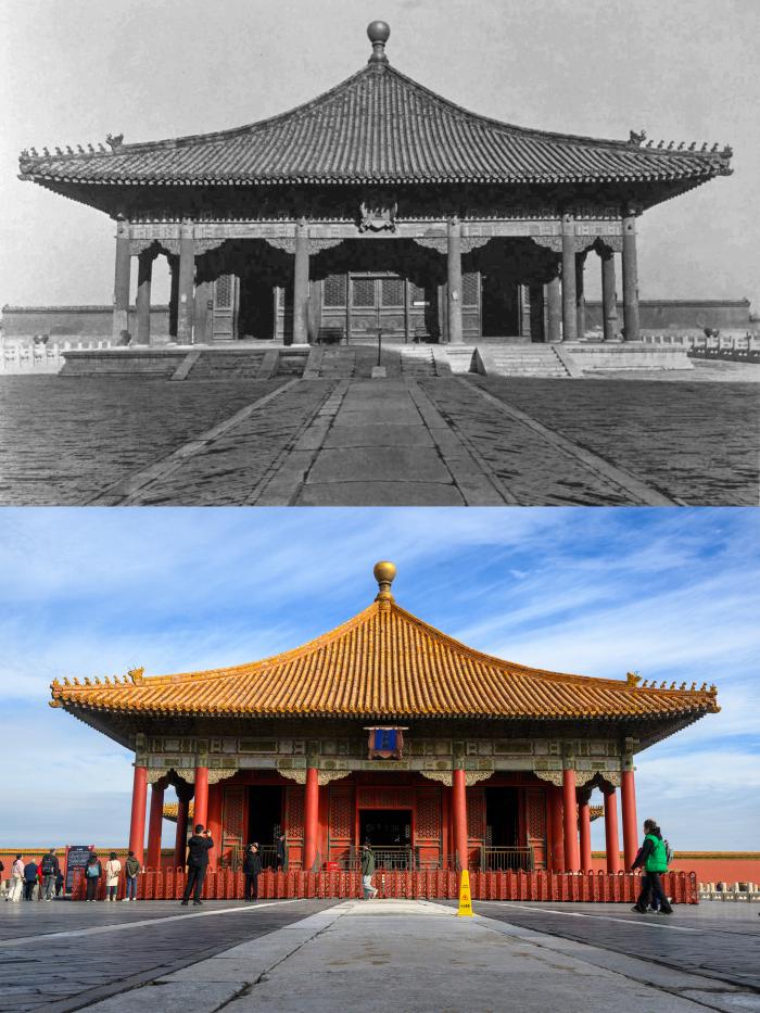 拼版照片:上图为20世纪初拍摄的中和殿(故宫博物院供图);下图为2025年10月10日拍摄的中和殿(新华社记者金良快摄)。新华社发