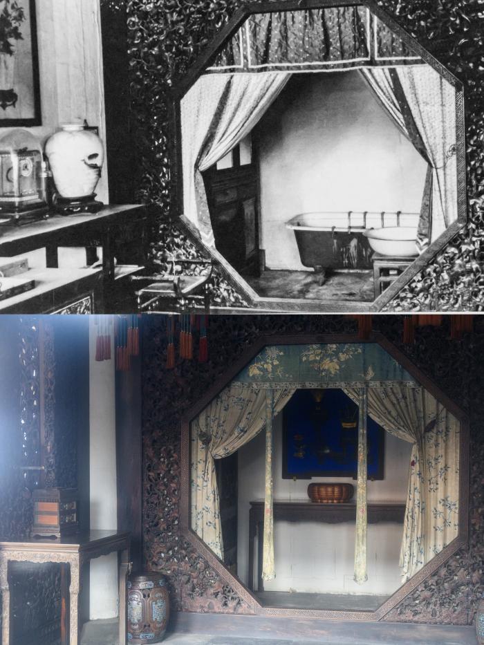 拼版照片:上图为20世纪20年代拍摄的储秀宫内景(故宫博物院供图);下图为2025年10月10日拍摄的储秀宫内景(新华社记者金良快摄)。新华社发