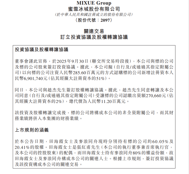 最引人关注的是交易背后的关联属性。公告显示,田海霞及麦浪同舟分别持有标的公司约60.05%及20.41%的股权。田海霞是张红甫的配偶,后者是蜜雪集团的执行董事兼首席执行官,及公司的控股股东。田海霞还持有麦浪同舟80%的权益份额,故田海霞及麦浪同舟构成公司的关连人士。