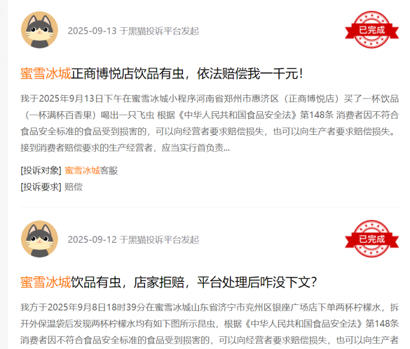 这并非孤例。2025年315期间,蜜雪冰城被曝宜昌某门店使用隔夜柠檬切片,杯盖中惊现飞虫,而黑猫投诉平台的数据则更直观反映了消费者的不满。