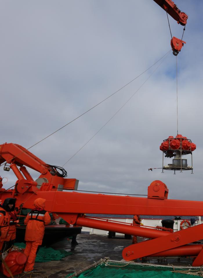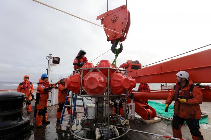 科考队员在回收海底生物影像观测系统(2025年8月14日摄)。