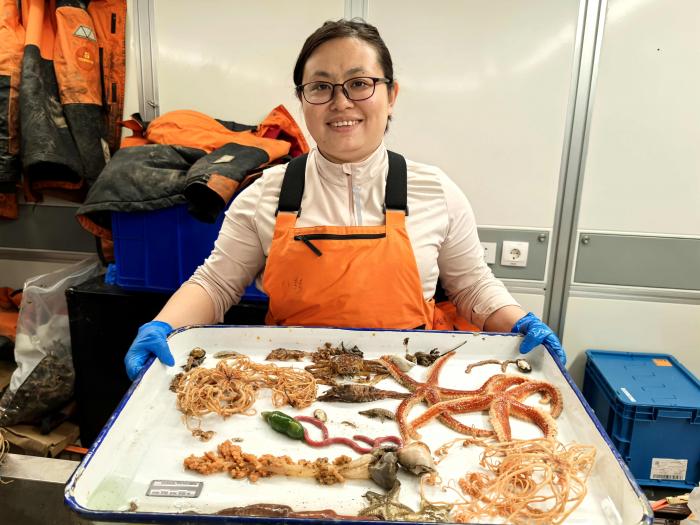 科考队员黄雅琴展示北冰洋底栖生物样品(2025年7月31日摄)。