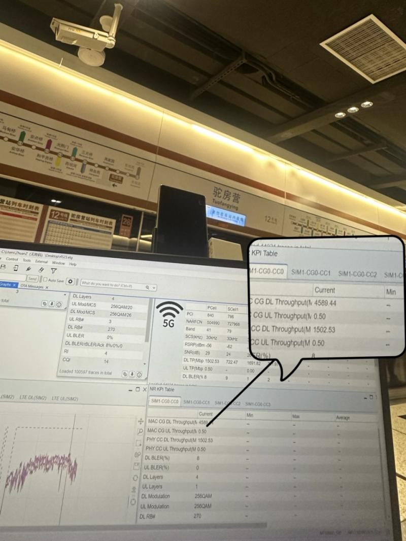 这一变化的背后,是北京移动与中兴通讯在节前合作完成的一项技术突破:双方在地铁12号线全线车站部署了5G-A 320M超大带宽四载波聚合技术(4CC),并实现了规模商用。4CC技术整合了2.6GHz与4.9GHz频段共320MHz频谱资源,结合多天线协同增强算法,将网络速率推向新高度。经现场专业设备测试,站台内平均下载速率超过4.4Gbps,峰值速率突破4.6Gbps,这让12号线成为国内首条4CC极速体验的地铁线路,为“数字出行”树立了全新的首都样板。