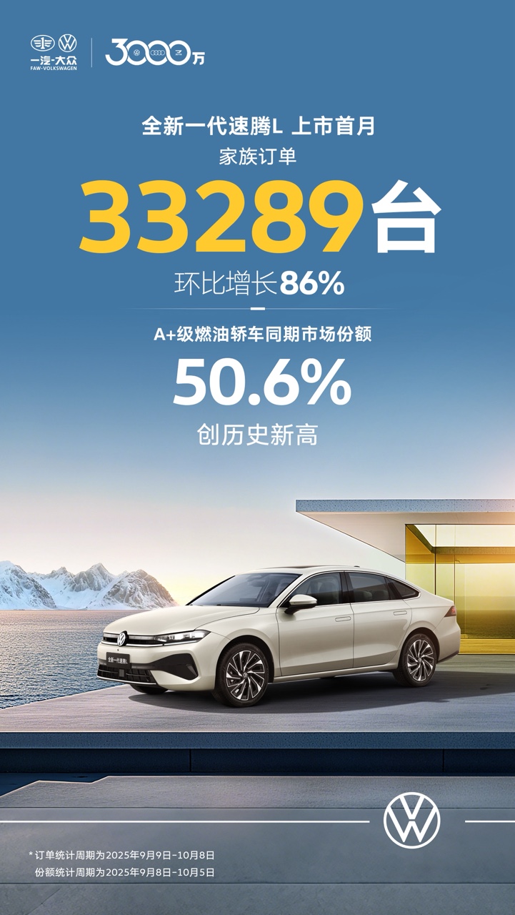 金秋十月,捷报频传。全新一代速腾L凭借全面进阶的领航实力上市即爆款,成功“引爆”速腾家族整体热度。上市首月,速腾家族销量高达33,289辆,环比劲增86%,A+级燃油轿车同期市场份额50.6%,创历史新高!