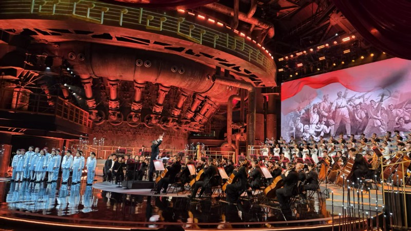 北青报记者了解到,高炉音乐会作为西山永定河文化节的“金名片”,已连续举办四年。2025年高炉音乐会再次震撼上演,以“山河永定•家国长安”为总纲,构建“红色追忆”与“多彩未来”上下两篇的史诗结构,用旋律串联起民族精神的传承与时代发展的脉动。演出作品既有《黄河怨》《保卫黄河》等经典红色歌曲,也有《喀秋莎》《啊 朋友再见》等外国曲目,同时还有《如愿》《哪吒闹海主题曲》等近年知名度较高的曲目。在空间重构上,充分利用三高炉的钢铁结构,将其转化为“可呼吸的舞台”——通过灯光投影技术,让高炉本身成为“叙事载体”,让观众在声与光的包裹中沉浸式感受历史与时代的对话。