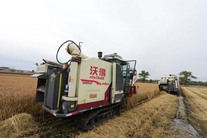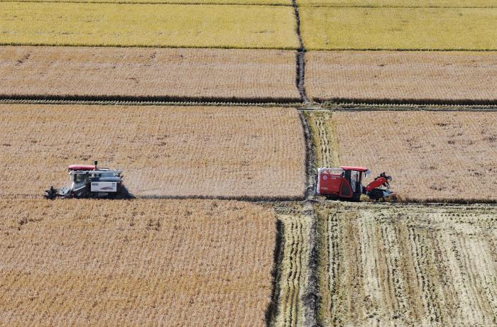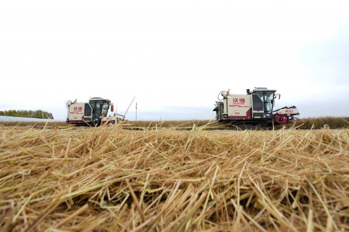 今年以来,黑龙江省聚焦粮食单产与品质提升,通过提高耕作水平不断提高粮食综合生产能力,夯实粮食丰收基础。在位于黑龙江省双鸭山市的北大荒集团友谊农场有限公司,机械设备在进行水稻收获作业(9月23日摄)。