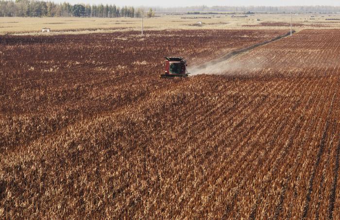 10月11日,在位于黑龙江省肇东市的北大荒集团四方山农场有限公司,机械设备在进行高粱收获作业。