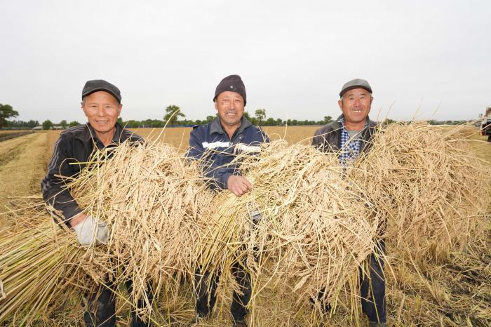 10月11日,在位于黑龙江省哈尔滨市的北大荒集团闫家岗农场有限公司,农户抱着刚收获的水稻合影留念。