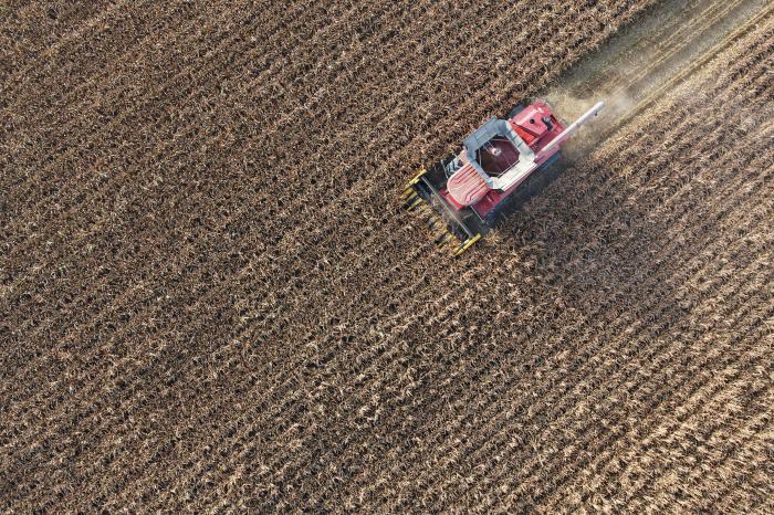 10月11日,在位于黑龙江省肇东市的北大荒集团四方山农场有限公司,机械设备在进行玉米收获作业(无人机照片)。