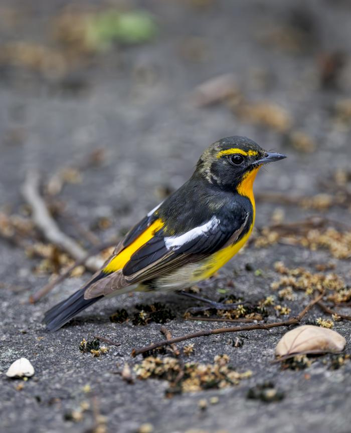 在福州乌山风景区,一只黄眉姬鹟在觅食(4月17日摄)。
