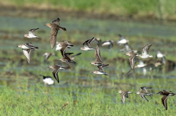 一只黄胸滨鹬(左三)和水鸟在位于福建泉港与惠安辋川交界的农田的上空飞过(9月9日摄)。