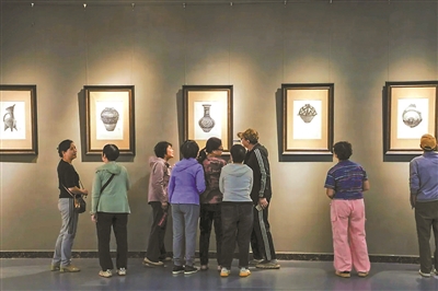 李鹏提到,之所以另辟蹊径选择用钢笔画来绘制文物,首先是与其他画种相比,钢笔画绘制的文物层次明显,更具有历史的厚重感;其次,钢笔细腻的笔触和丰富的线条能够精准地捕捉文物的每一处细节。不管是古老青铜器上神秘庄重的纹饰,精美瓷器上的繁复彩绘与细腻釉体,还是古朴石刻上历经岁月摩挲的纹理,不论文物质地为何,都能通过钢笔逐一呈现。