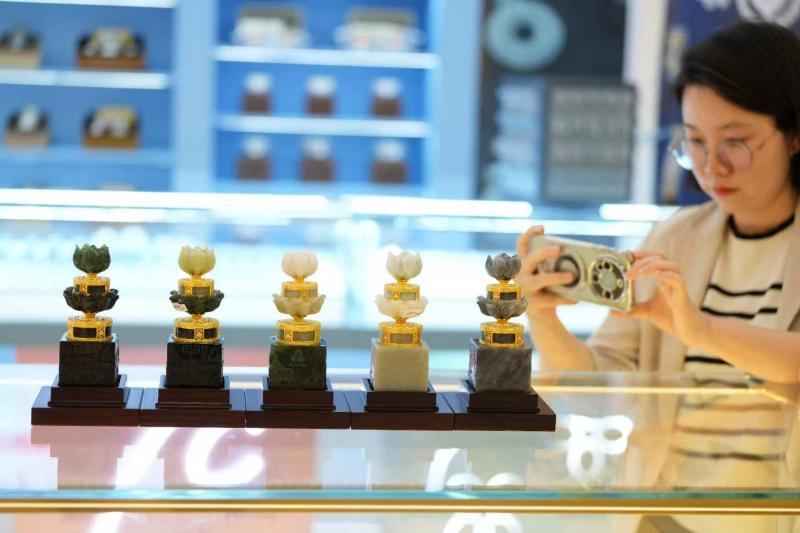 《全运徽宝》全系列作品以不同材质的玉打造而成,分别为和田青玉、和田碧玉打造的纪念版;和田青白玉、和田碧玉、和田青玉打造的珍藏版;和田白玉、和田青白玉、和田碧玉打造的典藏版;翡翠、和田白玉、和田青白玉打造的尊耀版;以及和田青花籽料打造的传世版。每套藏品均配有官方收藏证书,限量发行。随着到场嘉宾共同为《全运徽宝》系列产品揭幕,标志着该系列特许商品正式在京公开亮相。闻讯而来的一位消费者表示:“我是冲着工美过往的奥运、冬奥作品口碑来的”。