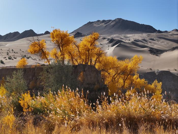 这是10月12日在甘肃省阿克塞哈萨克族自治县多坝沟胡杨峡景区拍摄的胡杨。新华社发(高宏善摄)