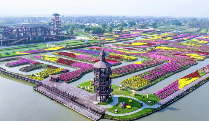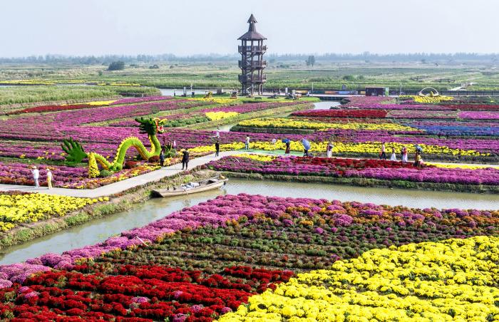 10月13日,游客在江苏省兴化市千垛景区赏菊游玩(无人机照片)。新华社发(周社根摄)
