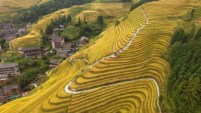10月12日,游客在广西桂林市龙胜各族自治县龙脊梯田景区观光游览(无人机照片)。新华社发(潘志祥摄)