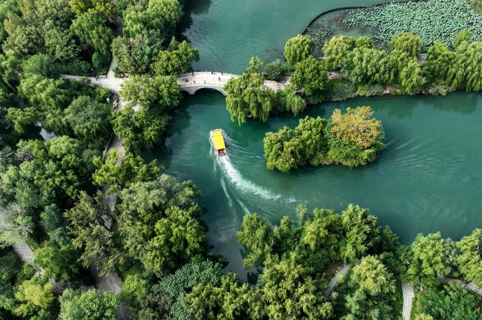 10月13日拍摄的山东省济南市大明湖秋色(无人机照片)。新华社发(郝鑫城摄)