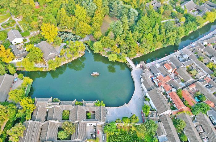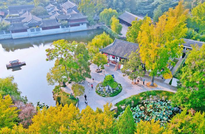 10月12日,游客在江苏省如皋市水绘园风景区游玩(无人机照片)。新华社发(吴树建摄)