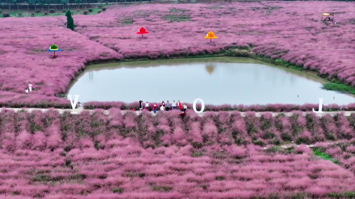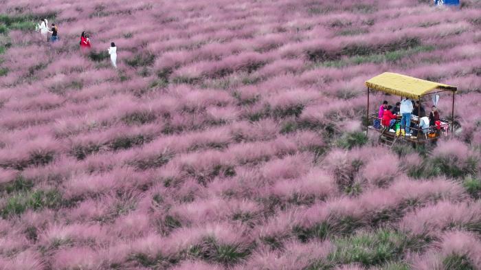 10月13日,游客在江苏省仪征市长兴农场的粉黛花海中游玩(无人机照片)。新华社发(齐立广摄)