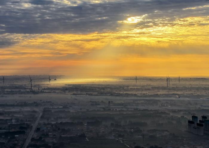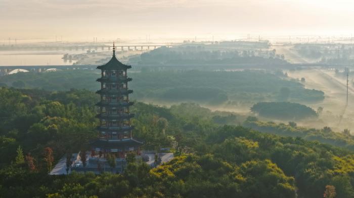10月13日拍摄的晨雾中的河北省邢台市广宗县俯瞰图(无人机照片)。新华社发(王垒摄)
