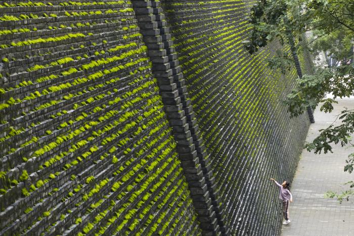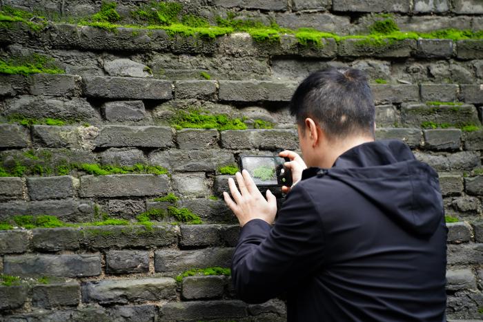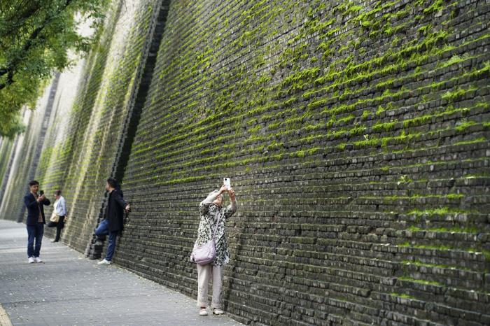 连绵秋雨过后,苔藓等植物为西安城墙披上了一层绿色的外衣,吸引市民和游人驻足观看、拍照。10月13日,游人在西安城墙北段拍照。