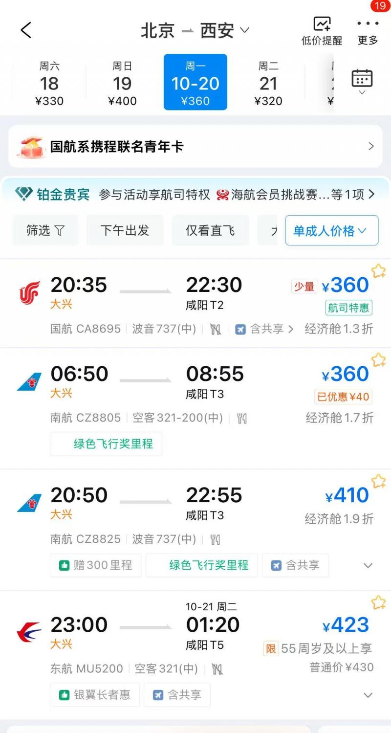 北青报记者在多家OTA、航司APP等搜索发现,北京飞国内多个热门目的地均有低价机票,例如,10月20日北京-西安的国航航班有经济舱1.3折的机票,售价仅为360元;北京-昆明的东航、南航、海航等均有经济舱2.4折的机票,售价700元左右;北京-广州的首都航空、东航等均有经济舱2.5折机票,售价600元左右;10月14日从北京飞往厦门的直飞航班,价格为400元……来自丰台区的消费者吴女生表示:“看到这么多‘骨折价’机票,真的有些坐不住了,打算把没休的年假请了。”