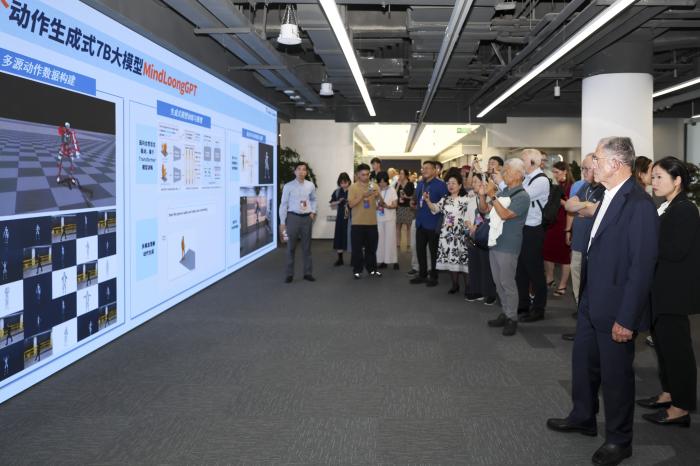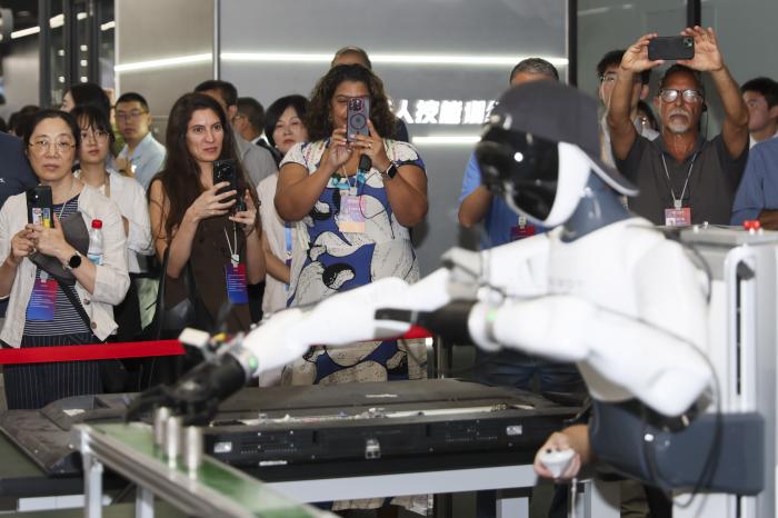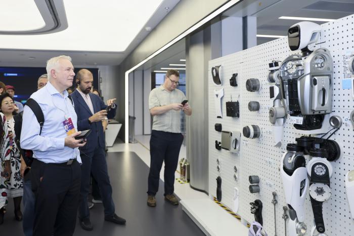 10月13日,嘉宾在上海浦东新区张江科学城内的“模力社区”参观拍摄人形机器人。新华社记者 王翔 摄