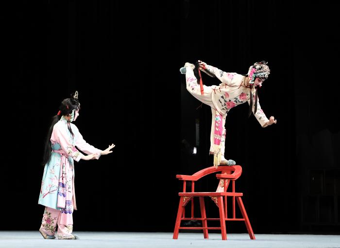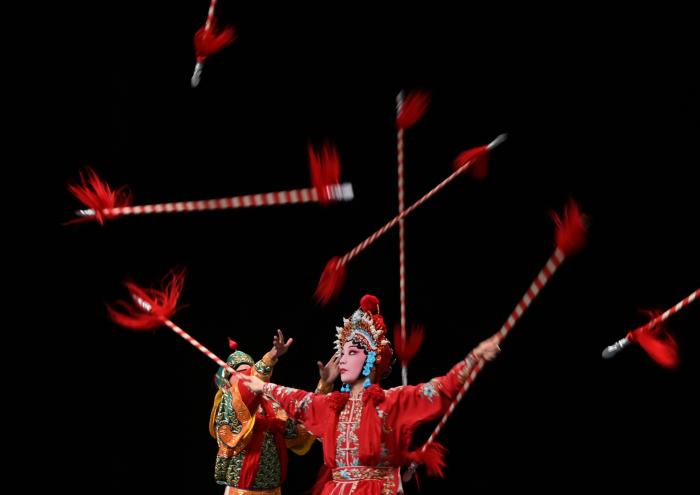 1956年,刚成立的浙江婺剧团即着手抢救婺剧传统遗产,收集记录了众多剧目、唱腔和器乐曲牌,留存了大量传统脸谱、戏装图样等珍贵资料。2011年,浙江婺剧团更名为浙江婺剧艺术研究院。10月12日,浙江婺剧艺术研究院的演员在表演婺剧。新华社发(王颂摄)