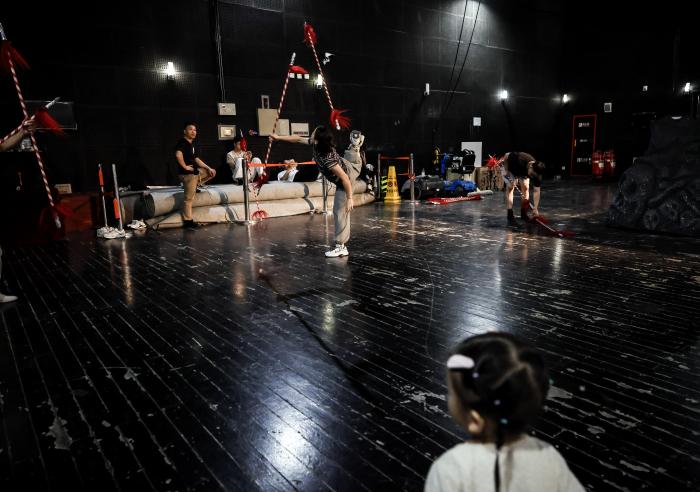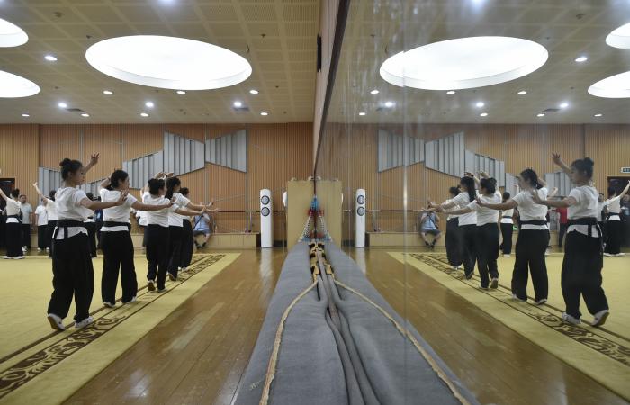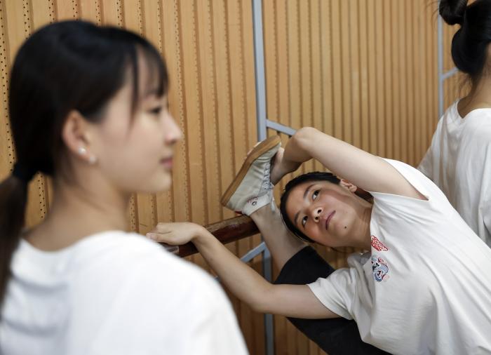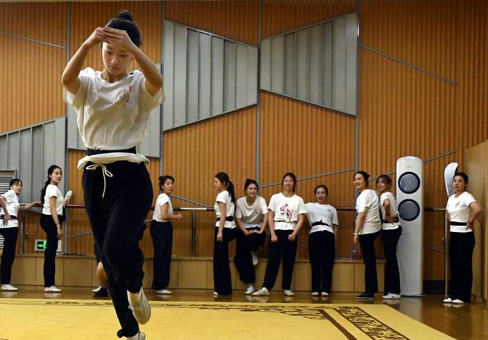 10月12日,浙江婺剧艺术研究院的演员在排练厅内练习基本功。新华社发(王颂摄)