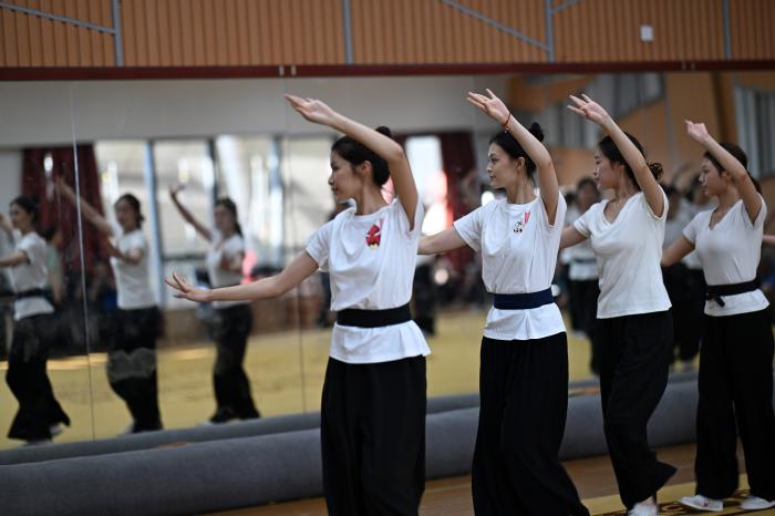 10月12日,浙江婺剧艺术研究院的演员在排练厅内练习基本功。新华社记者 鲁鹏 摄