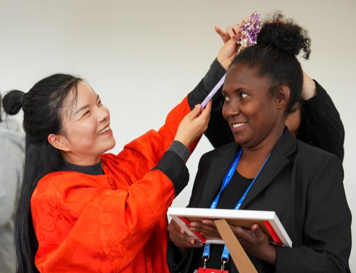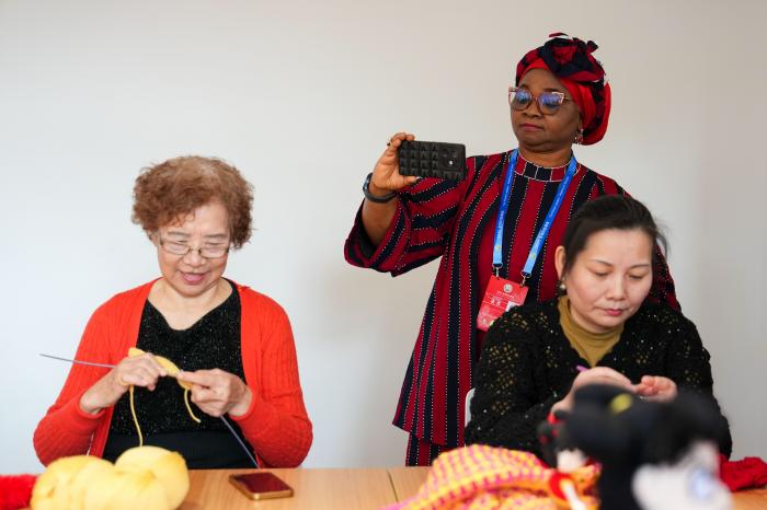 10月14日,嘉宾在北京市顺义区妇女儿童社会服务中心体验非遗手工。