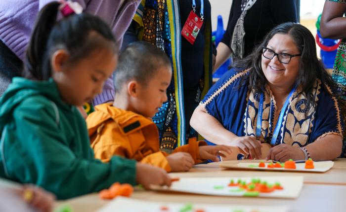10月14日,嘉宾在北京市顺义区妇女儿童社会服务中心和孩子们一起做手工。