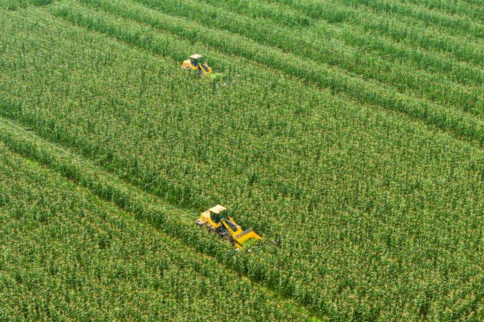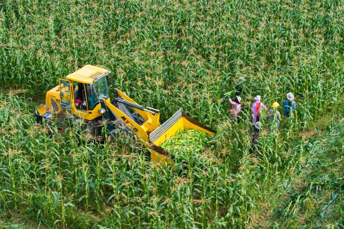 10月14日,在南县华阁镇新安村,村民在采摘水果玉米(无人机照片)。