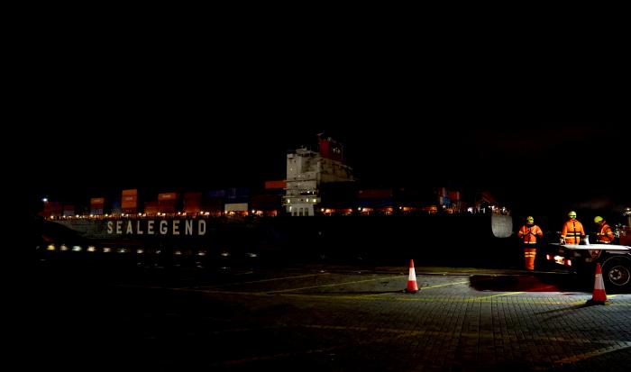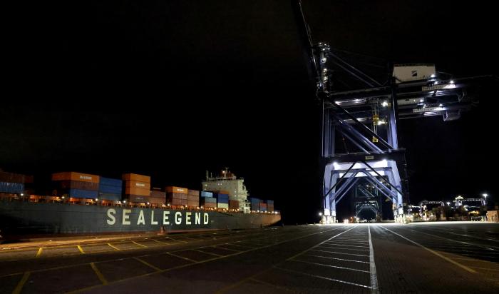 10月13日,中欧北极快航航线首艘货船在英国费利克斯托港停泊卸载集装箱。