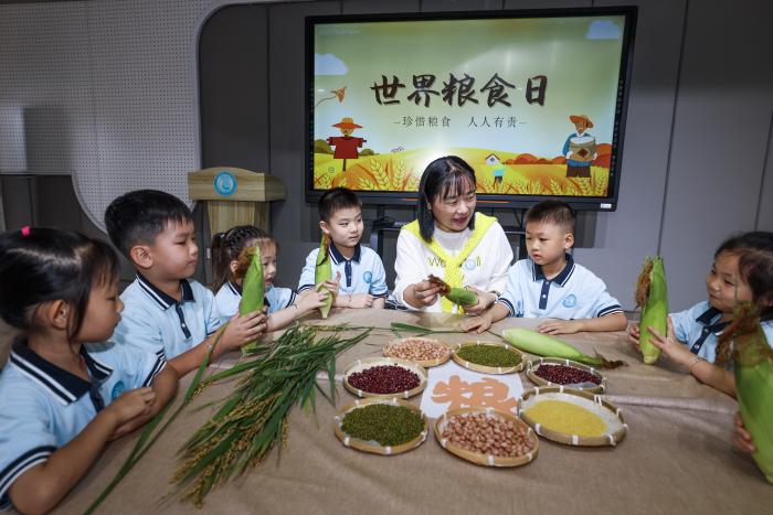 10月14日,浙江省湖州市吴兴区东林镇中心幼儿园的老师带着孩子们开展世界粮食日主题课程,了解各类粮食知识。