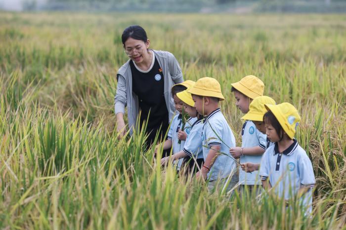 10月14日,在浙江省湖州市吴兴区东林镇保永村的稻田里,东林镇中心幼儿园的孩子们在种粮大户的带领下近距离观察稻穗,体验收割。