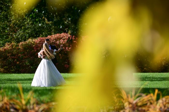 10月13日,一对新人在波兰华沙大学屋顶花园拍摄婚纱照。