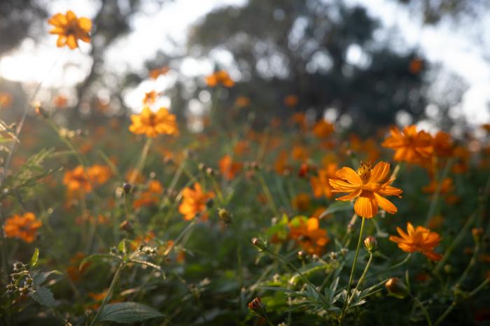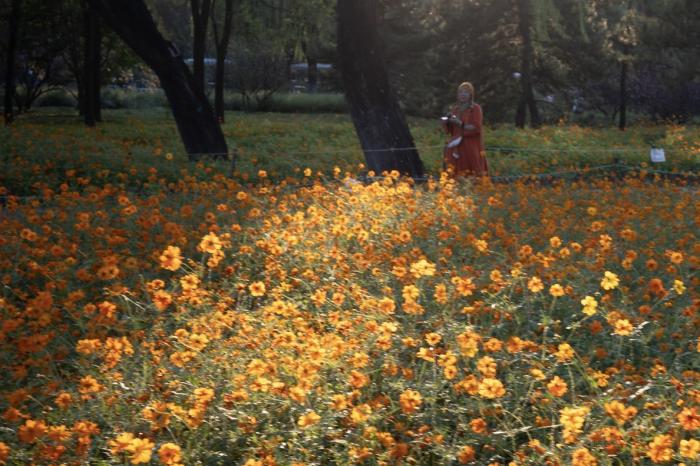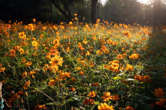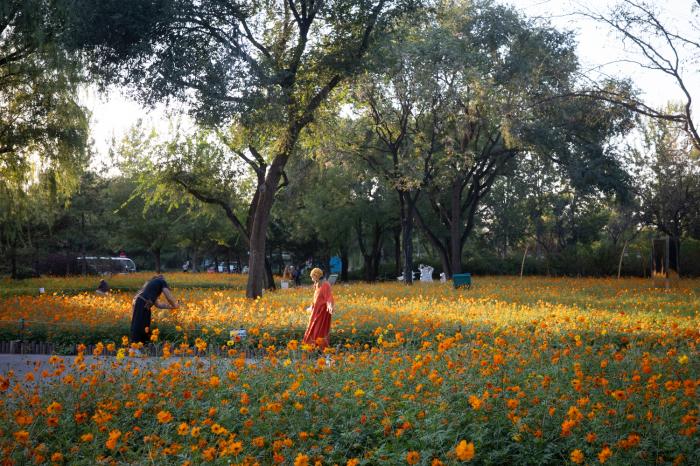 夕阳西下,朝阳公园北园黄秋英盛放。