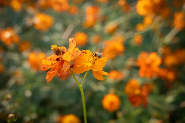 黄秋英花海一片金黄,蜜蜂落在花蕊上采蜜。