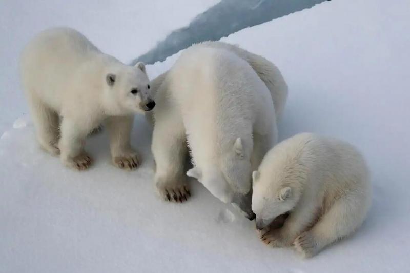 8月30日夜,在距离考察队长期冰站作业结束还剩一天时,一只北极熊妈妈带着两只熊宝宝出现在了考察队员搭乘的“雪龙2”号极地科考破冰船船边。