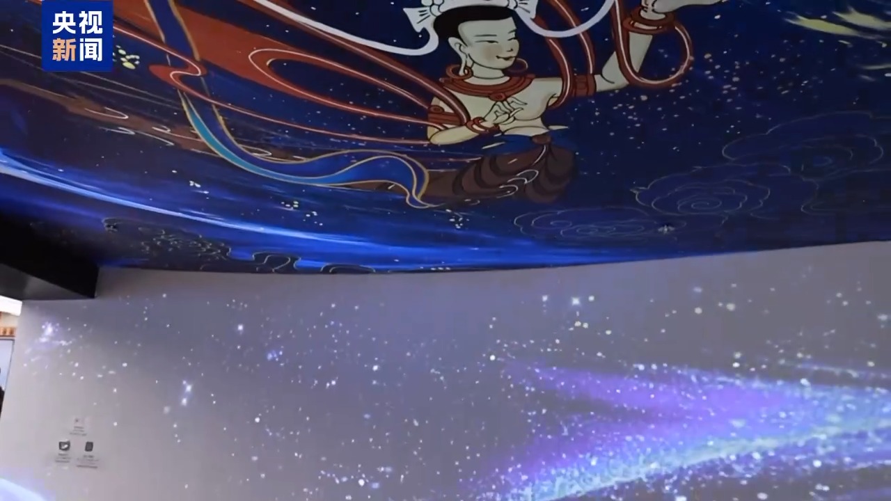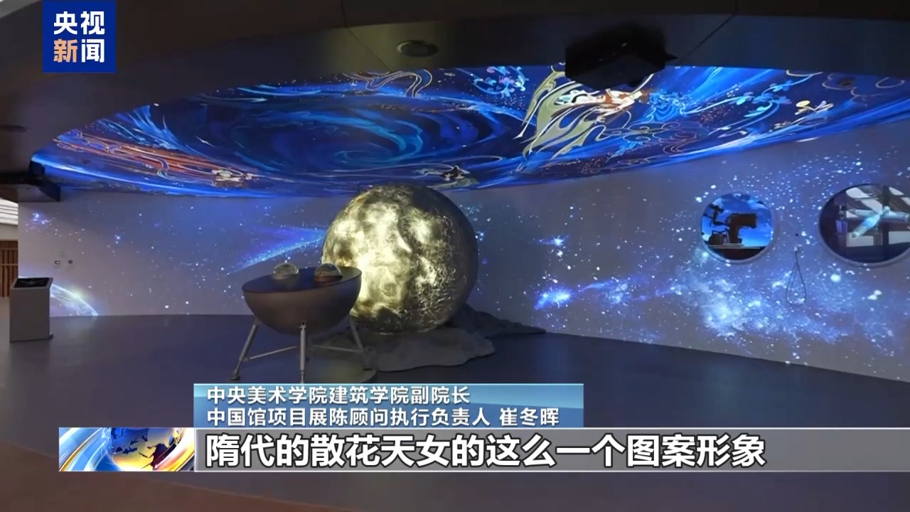 中央美术学院建筑学院副院长、中国馆项目展陈顾问执行负责人 崔冬晖:我们用了常老师描绘的隋代的散花天女的图案形象,在顶部发光。人们去看月壤的时候,球体能够反射到上面的散花天女,用艺术的方式体现了中国人极致的浪漫。