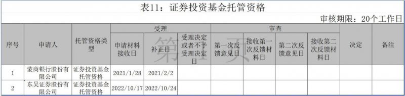近日,证监会发布的《证券、基金经营机构行政许可申请受理及审核情况公示》显示,排队申请证券投资基金托管资格的机构仅剩两家,分别是蒙商银行和东吴证券,这两家机构的申请材料接收日分别为2021年1月28日和2022年10月17日。