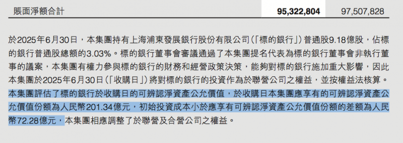 财报显示,截至6月30日,中国信达持有浦发银行9.18亿股(3.03%),提名代表获董事会非执行董事席位,可参与财务与经营决策,形成重大影响。当日按权益法核算该联营公司投资,应享可辨认净资产公允价值份额201.34亿元,较初始成本溢价72.28亿元,已调整相关权益科目。
