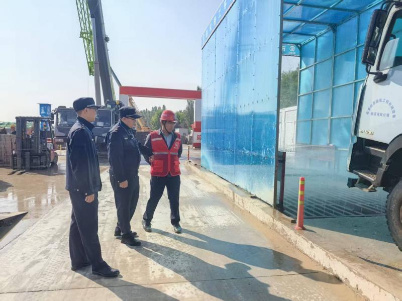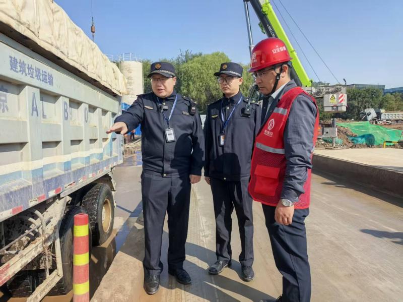 在海淀区上地街道某施工工地,执法人员详细检查工地的苫盖情况,并向负责人强调,每次施工结束后要及时覆盖苫布,平时做好路面洒水降尘、运输车辆车轮冲洗等防尘降尘措施。